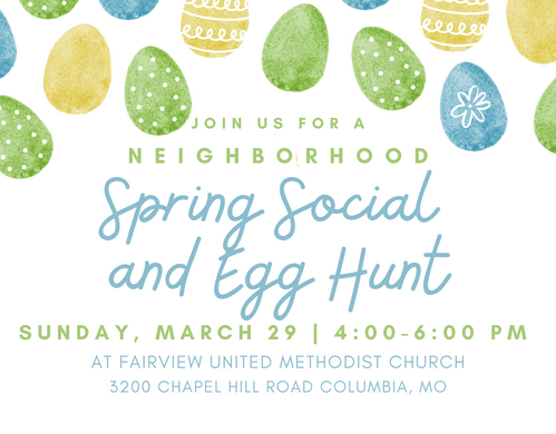 Join us for our Fifth Annual Neighborhood Spring Social on Sunday, March 29 from 4-6 PM at Fairview United Methodist Church- 3200 Chapel Hill Road.